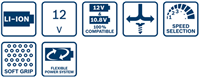 Integrated LED light for illuminating the work area, even in dark places | 06019A6977 - GDR 12V-105 Professional | | Torque, max. (hard/soft) | 105Nm | | No-load speed | 0-2.600 min-1 | | Battery voltage | 12 V | | Impact rate | 0-3.100 min-1 | | Max. screw diameter | M 4 - M 12 | | Battery capacity | 2,0 Ah | | Shipping dimensions (LxWxH ) | 360x440x150 mm | | Weight incl. battery | 0,96 kg | Included items: -
