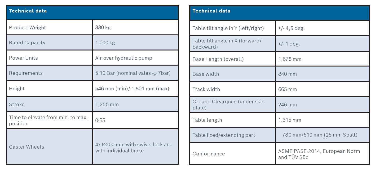 This lift table has a lower lifting capacity and a smaller wheelbase than "its big brother" 222 3502 022 00. We recommend it for workshops that do not plan to work on the large and heavy electric batteries.